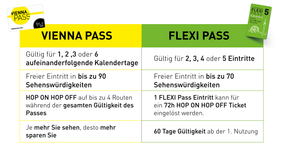 *Mit dem Vienna PASS erhalten Sie einmaligen Zutritt zu den Sehenswürdigkeiten, mit Ausnahme der HOP ON HOP OFF Busse der VIENNA SIGHTSEEING TOURS, die sie während der gesamten Gültigkeitsdauer Ihres Passes beliebig oft nutzen können.