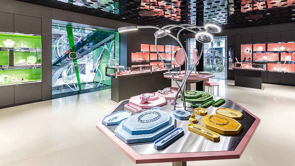 In the heart of Austria’s capital, at Kaerntner Strasse 24, Swarovski Kristallwelten Store Wien rolls out the carpet to a sparkling world of amazement and shopping. With the cubes on its striking façade, and the constantly reinvented performance stage in its showcase window, the exterior serves as a foil for the intentional fusion of modern art and glittering product presentation – a fusion that continues inside the brand world, over three richly designed floors. Indeed, each floor in itself is a journey of discovery, where guests encounter such luminaries as Susanne Rottenbacher, Yves Béhar, and Tokujin Yoshioka.