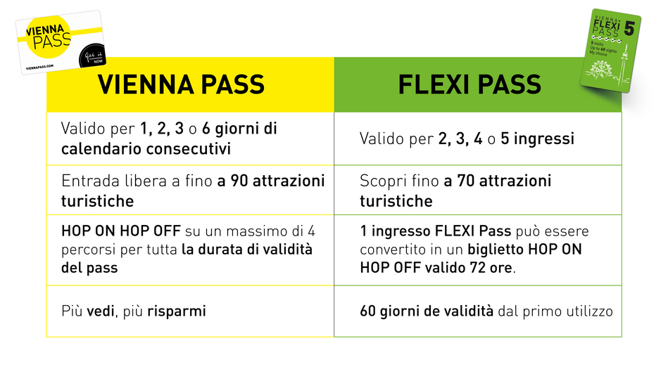 Il Vienna FLEXI Pass è disponibile per 2, 3, 4 o 5 visite e nelle varianti adulto (dai 19 anni) e junior (dai 6 ai 18 anni).